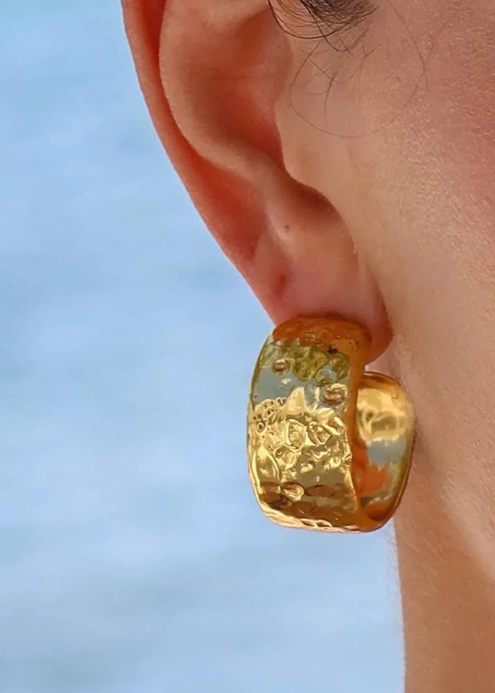 Inspired by the golden shimmer of sunlight dancing on ocean waves, the Aurelia Surf Hoops capture the effortless beauty of summer by the sea. Their rich, textured surface reflects light from every angle, radiating warmth and elegance.