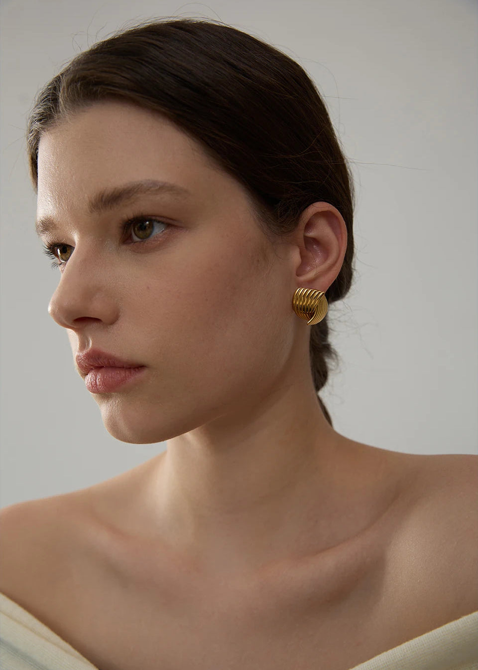 Crafted from durable stainless steel and finished with a gold plating, each earring features a bold yet graceful silhouette reminiscent of rippling tides. The meticulous detailing and fluid design ensure these earrings remain striking from every angle.