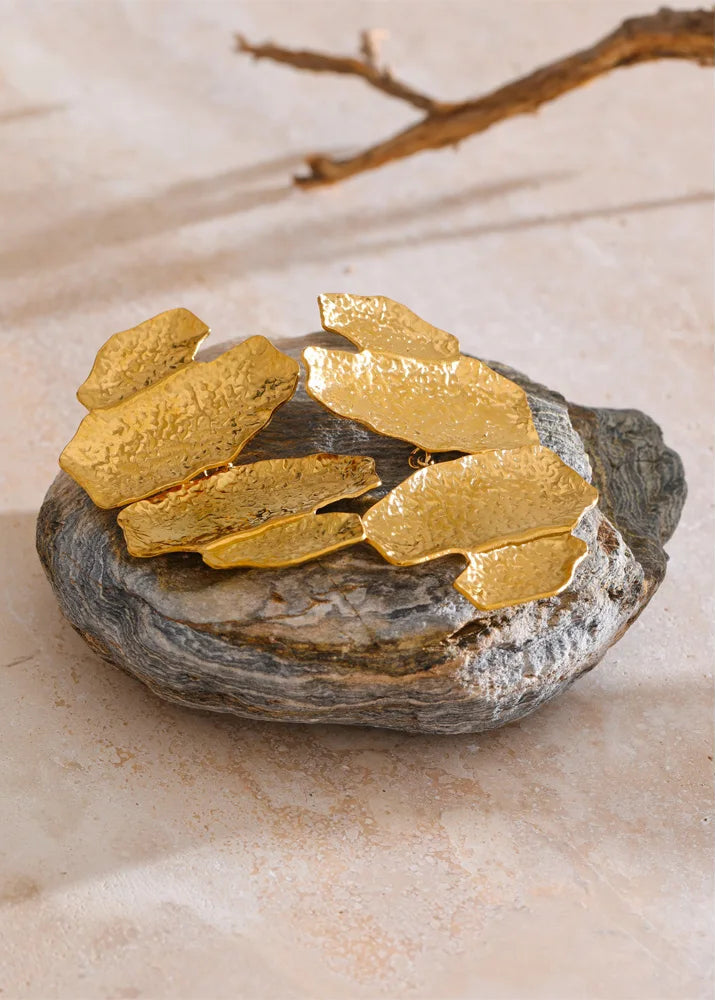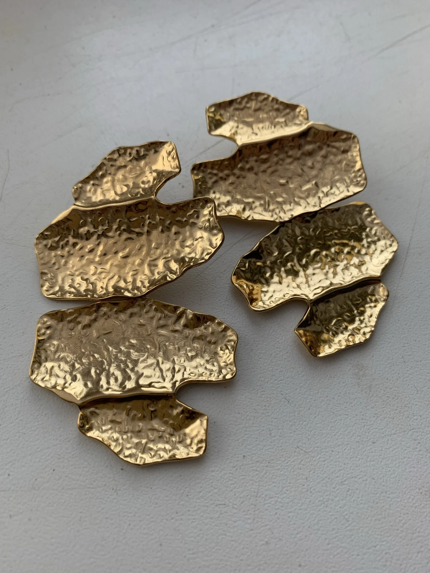 Evoking the artistry of hand-sculpted metal, the Serava Crest Earrings feature bold, overlapping forms that create depth, dimension, and undeniable presence. Their textured surfaces mimic the organic irregularities of nature, adding a tactile richness that catches the light in striking ways.
