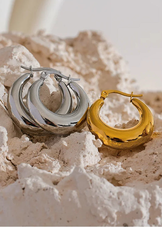 Crafted from high-quality stainless steel with premium gold or silver plating, these statement hoops feature a bold, rounded silhouette that catches the light beautifully. Lightweight yet substantial, they’re designed for all-day comfort without compromising on style.